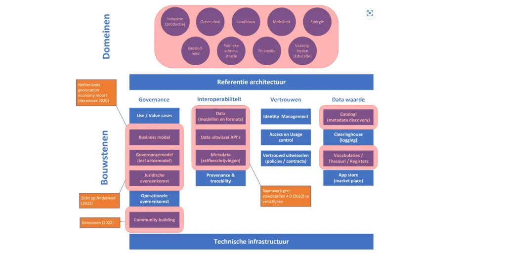 In het model bovenaan dit artikel zijn in blauw de bouwstenen aangegeven die Europa hanteert bij de ontwikkeling van data spaces. Onder de vlag van INSPIRE en met de realisatie van Nationale Geo-Informatie Infrastructuur (NGII) heeft de geo -sector in Nederland het afgelopen decennium al verschillende bouwstenen voor een data space gerealiseerd. Deze zijn oranje gemarkeerd in bovenstaand model.