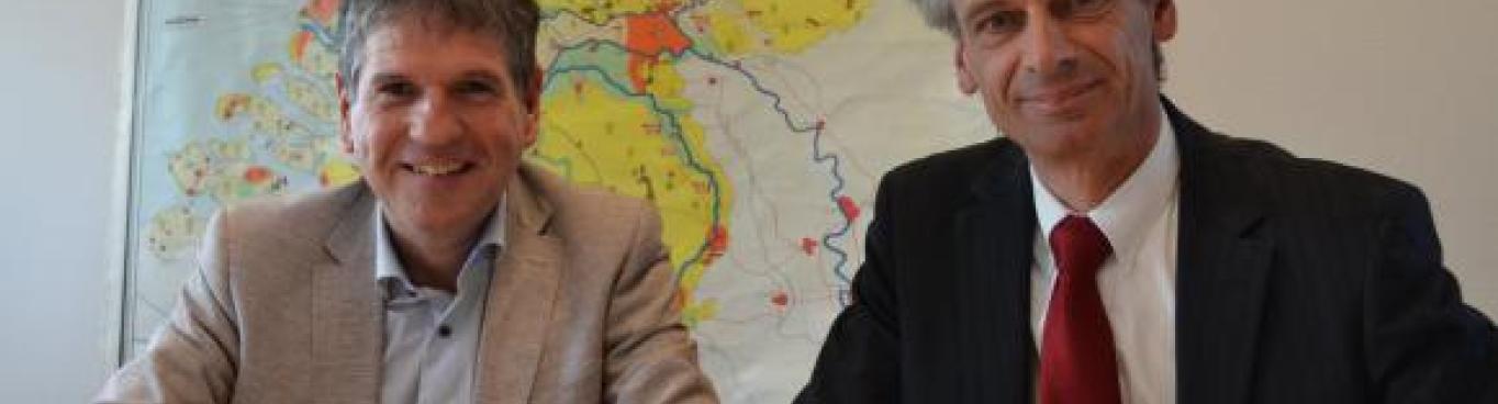 Hugo Gastkemper, directeur van Stichting RIONED en Rob van de Velde, directeur van Geonovum hebben donderdag 14 juni 2012 hun handtekening onder een samenwerkingsovereenkomst...